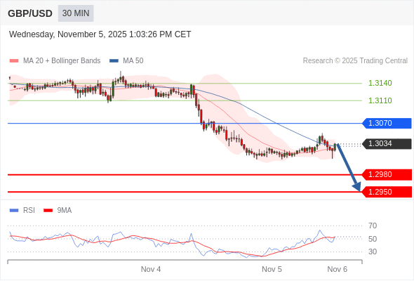 在 1.3070 之下,看跌,目标价位为 1.2980 ,然后为 1.2950 。